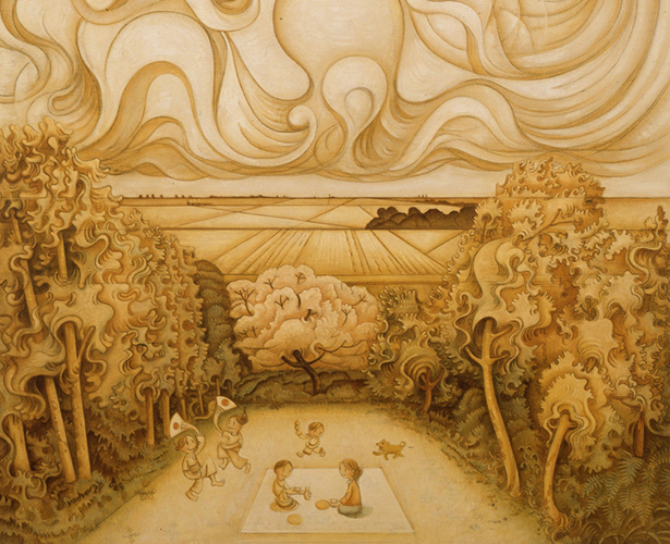 宴会が好きな僕は、この数年とても辛かったのです。 この絵は、春の陽だまりの中で、家族が田園の中の杜で酒盛りをしていると、精霊も浮かれ出てくるという、なんてこと無いところが気に入っています。