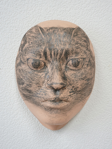 やきものは僕の変身願望を満たす素材の一つです。素焼きした自分のライフマスクに、鉛筆で猫を素描しました。他人との関わりの中で、ついつい良い子をとり繕ってしまっても本質が滲み出てしまう、どうしようもない経験から。