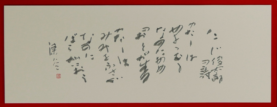谷川俊太郎の詩「にじ」の一節を書いた。「人間の五感で解かる書を書きたい」という自分の気持ちに合う詩だった。紙面に広がる空気感を大事にしたいと思う。