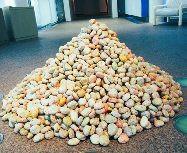 バブル直前のころ、日々家庭に流れ込んでくる購買欲や消費をあおる大量の広告紙から、わたしの広告として作り変えるために紙漉きしていたが、沈殿物の処理に困り残滓も残らず握り固めたのが「情報の石」である。