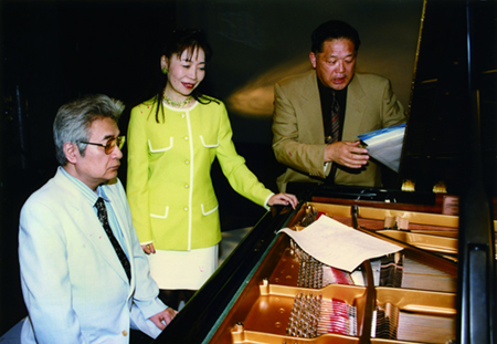 左からジャズピアニストの故・前田憲男氏、佐々木さん、演出の生長康氏 -