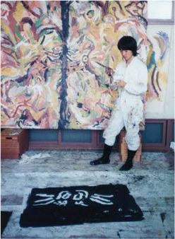 当時描いていたような即興的な絵は、ちょっと油断するとすぐマンネリになっちゃうんです。僕は実存型と呼んでいますが、自分の内面から感覚で出していくような絵は、魂が乗らないと、ただ絵の具がキャンバスに乗っているだけになってしまいます。そこを何とか絞り出して、その日のうちに決着つけて帰るぞ、という感じでやっていたので、いつもアトリエに行くときは、自分のテンションを上げて行っていました(笑)。で、そういう気分だから、すぐ癇癪を起こしてしまう。テニスのマッケンロー選手ではないですが、ラケットを折るのと同じ感覚で、画面に投げつけた筆が刺さってしまったこともありました。もともと多動症気質で、その気質をそのままリンクさせて描いていたので、1日1時間半ぐらいで一気に勝負をかけるような感じでした。