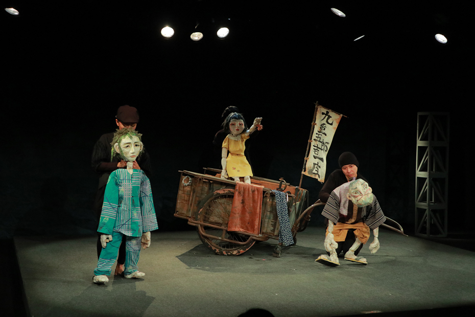 愛知人形劇センター製作「人形劇 寿歌」は、この戯曲の本質をあらためて示唆。「もの」と「ひと」の間に存在する人形は、作者・北村想の言葉の力と深い思考を真っすぐに伝えてくれた。半面、顔の変わらない人形から観客は自由に表情を読み解くことができるので、作品の多面性は高まる。「寿歌」は1979年初演の際、4組のキャストが競演したことで知られるが、それと同じように1つのイメージに縛られない上演を実現していた。