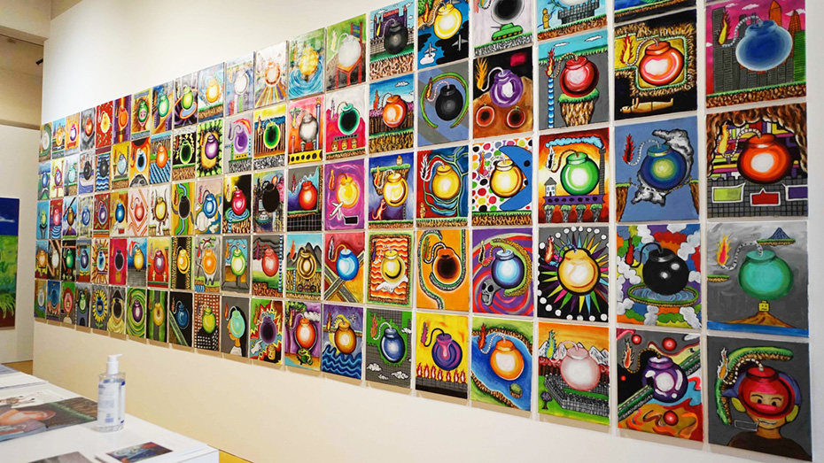 爆弾のモチーフは、僕が子どもの頃に流行ったテレビゲームからきています。子どもの頃は体が弱く、喘息を患っていたため、日常生活を送るのも辛い時期がありました。発作が起こるのを避けるために、体育の時間に一人だけ図書館に行って絵を描いたり、歴史の本を読んだりしていました。歴史の本にはルネサンスや戦争画など、様々な絵画が多く掲載されていて、そこから想像力を膨らませ、自分なりにスケッチして遊んでいました。